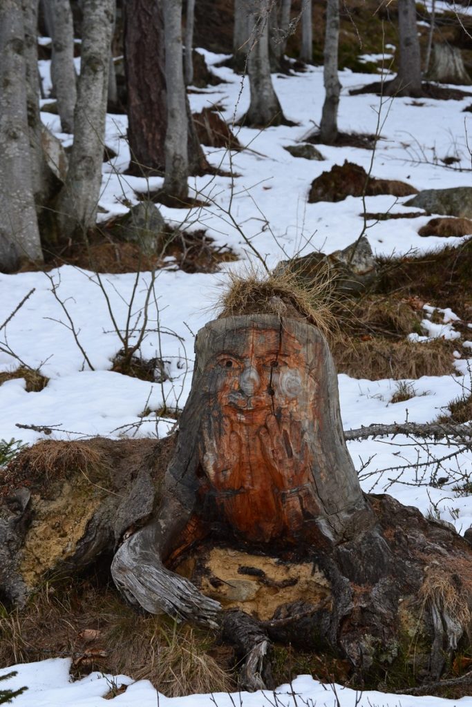 Gutwiarhini, Holzfigur im Val QuarazzaGleich hinter der Kirche findet sich der Stausee des Flusses Quarazzolo, der Lago delle Fate.